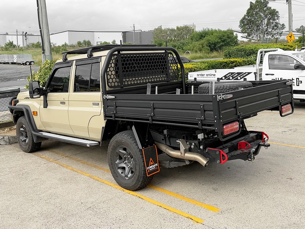 This aluminium black powder-coated ute tray comes with sides, headboard with mesh, tie down rails, mudguards, LED lights, light protectors, number plate bracket with light and fitting kit.